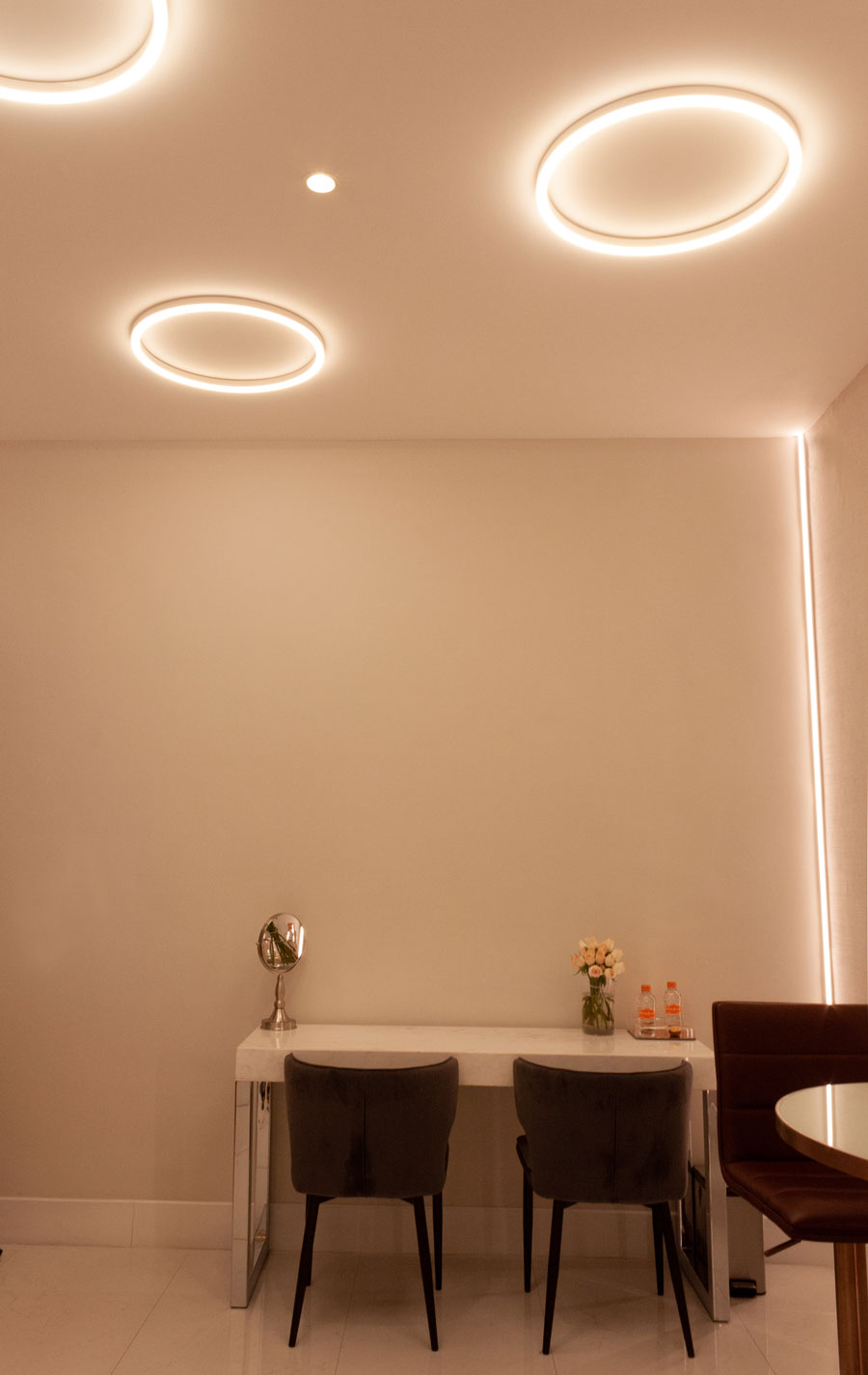 El diseño de iluminación, en este proyecto, tomó un papel esencial, ya que mediante él se crea una atmósfera de relajación que despierta a todos los sentidos y hace sentir especial a cualquiera que lo visita.